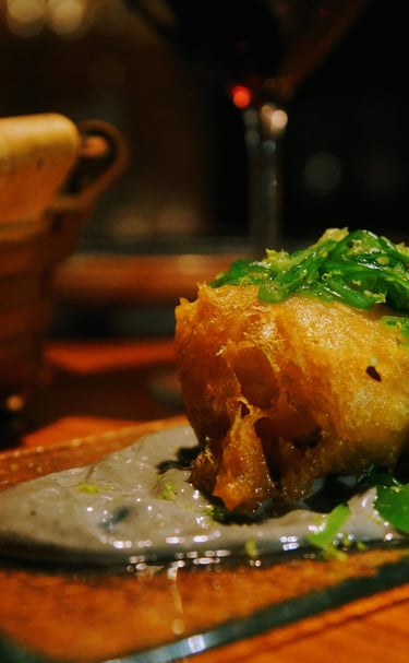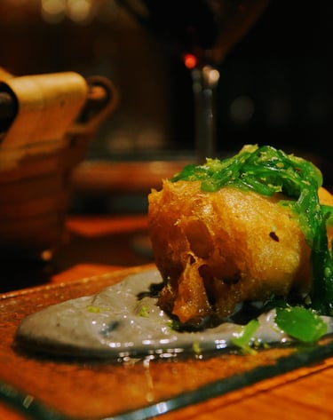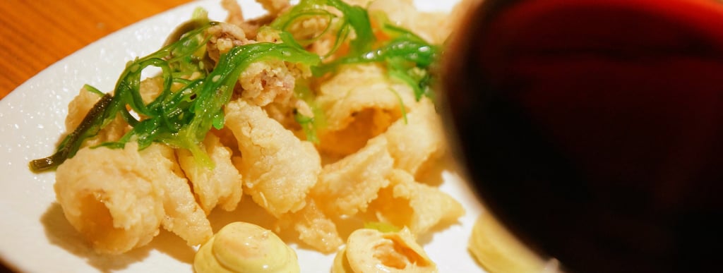 Rabas de chipirón fritas al momento, acompañadas de alioli suave de curry amarillo y ensalada de alga wakame.